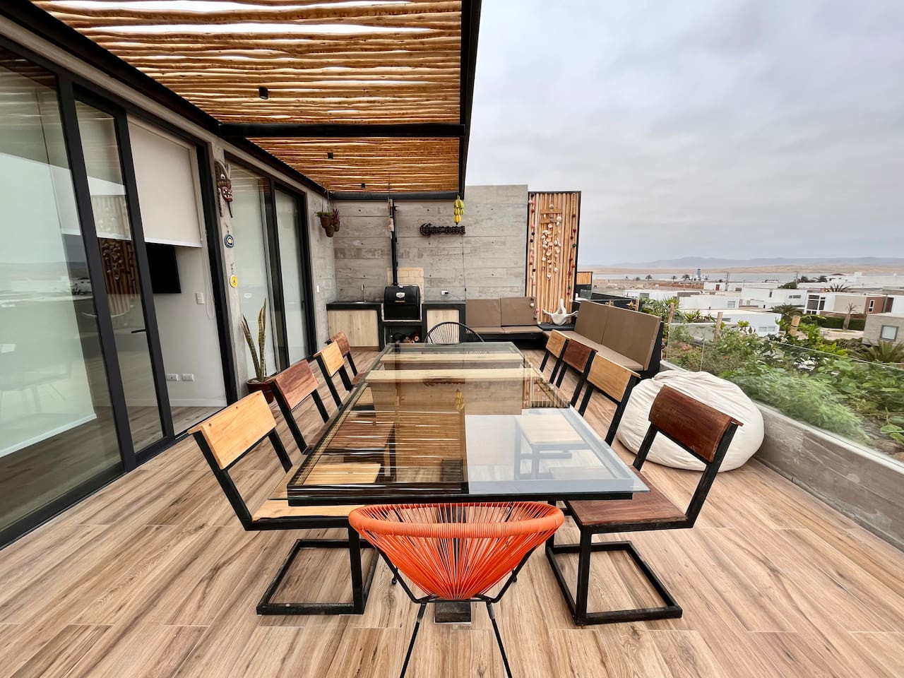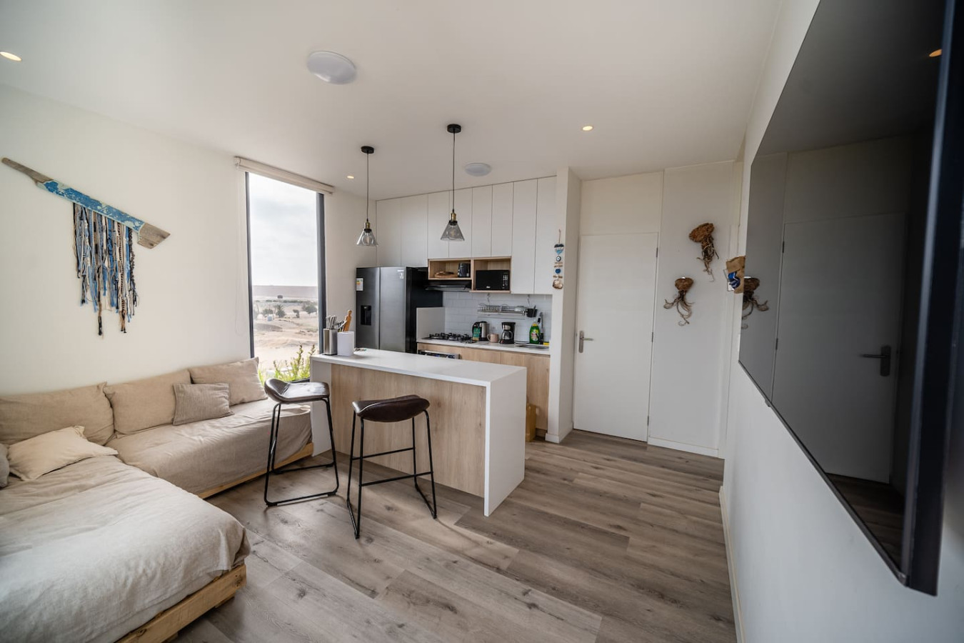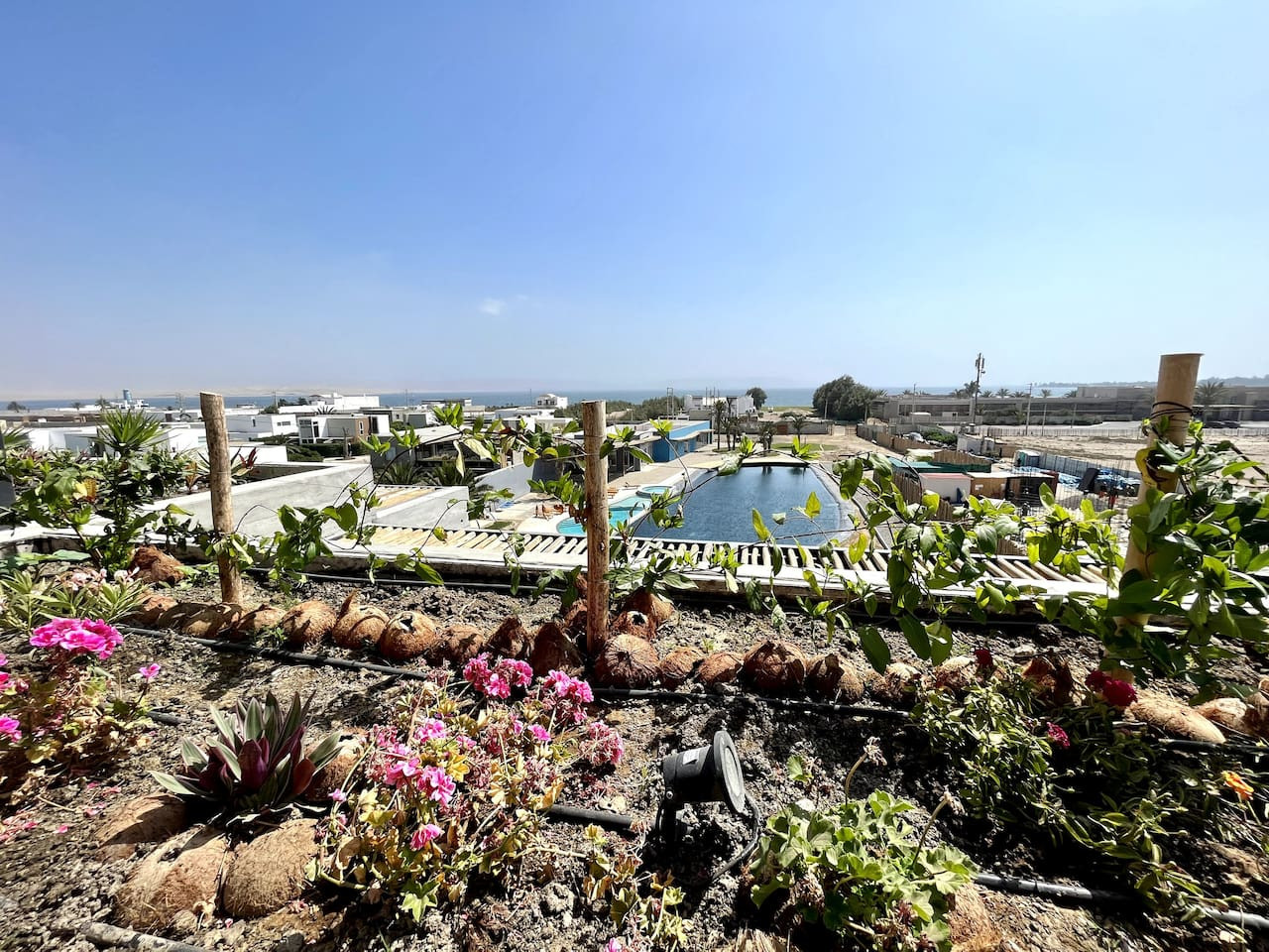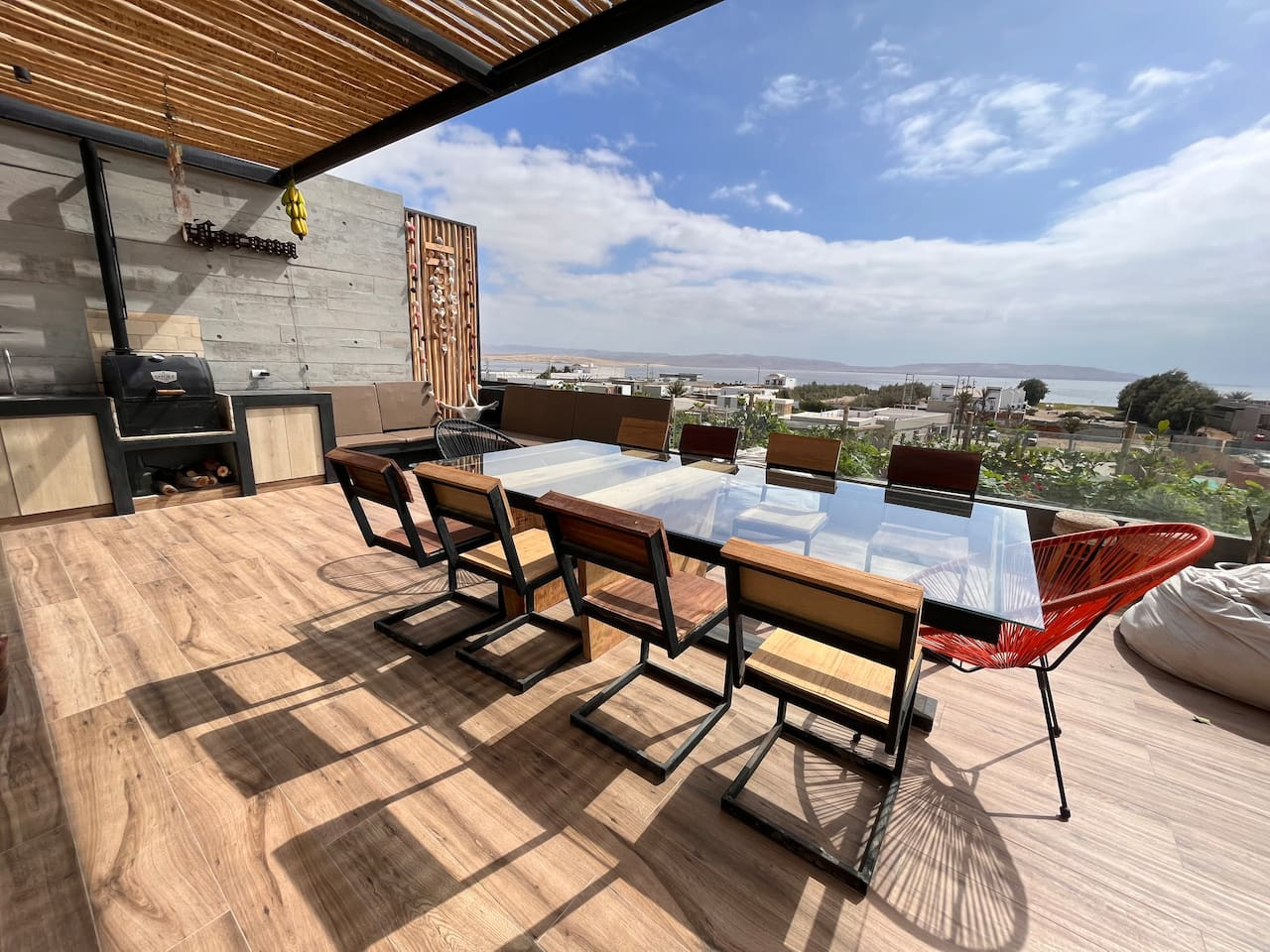 / nightDesigned for singles & couples, this unique apartment suits kitesurfers, fitness lovers, and remote workers. Personal touches abound, with the owner handcrafting most furniture and decor. Top-floor(4th) location with a stunning rooftop terrace for ocean & National Reserve views. Fully stocked kitchen, comfy king bed, BBQ, ourdoor garden & fiber optic internet. 5min walk to Kite Point, 1km to Paracas National Park. Onsite coworking & gym facilities. Perfect for long-term stays. he apartment is modern, built in 2021 and comes with more than necessary amenities. You can expect to rent for a weekend and want to stay a month! Please note that this unit is located on the 4th floor, without an elevator, but the breathtaking views make the climb worth every step! The apartment offers ample outdoor terrace space, allowing you to fully embrace the beauty of Paracas. Inside, you'll find an open kitchen and living area, a bedroom with generous closet space, a bathroom with desert views, and a washing machine just before entering. Most notably, the rooftop terrace provides stunning vistas of the National Reserve and the ocean. A combo charcoal grill and smoker is on the terrace for guests to enjoy delicious outdoor cooking while watching the stunning sunsets. Our community is the home to many kite surfers and sports enthusiasts, creating a vibrant atmosphere. Guests can step out of the apartment and reach the entrance of the National Park (Reserva Nacional de Paracas) in just 1.3km, perfect for morning runs or bike rides within the reserve. Afterwards, take a refreshing swim in the 40m saltwater lagoon or enjoy a dip in the pool. The common areas and the community itself contribute to the unique experience of staying in this apartment. Notably, this unit is environmentally friendly, featuring handmade furniture, decor, and a bohemian vibe. It is also the most economical option in Aldea, so take advantage of this exceptional value! From April 15, 2024, to April 15, 2025, there will be a construction project taking place within the condominium. While there may be some noise during business hours, all common areas will remain fully accessible. To thank you for your patience, we are offering a special discounted rate during this period. We appreciate your understanding!