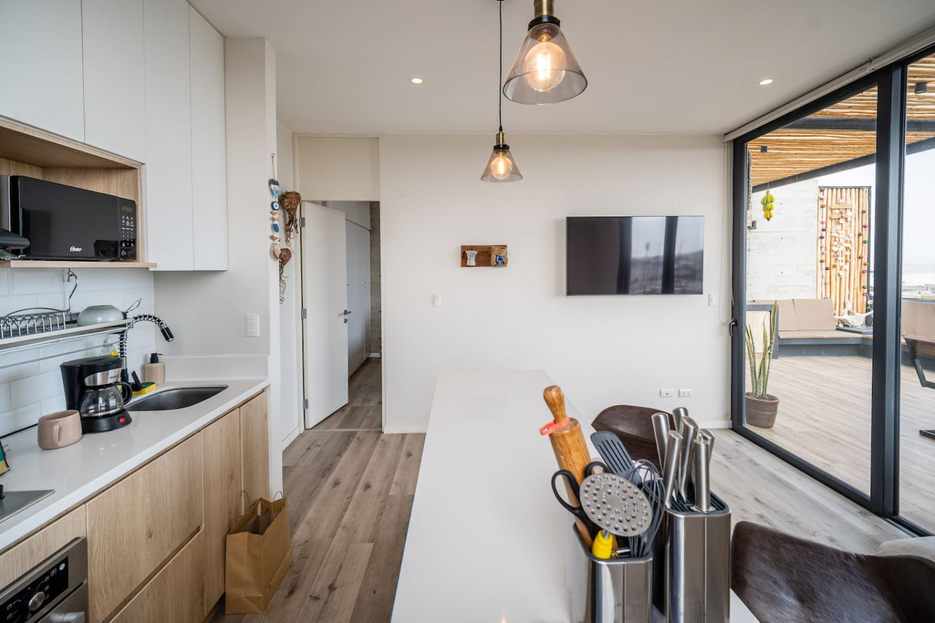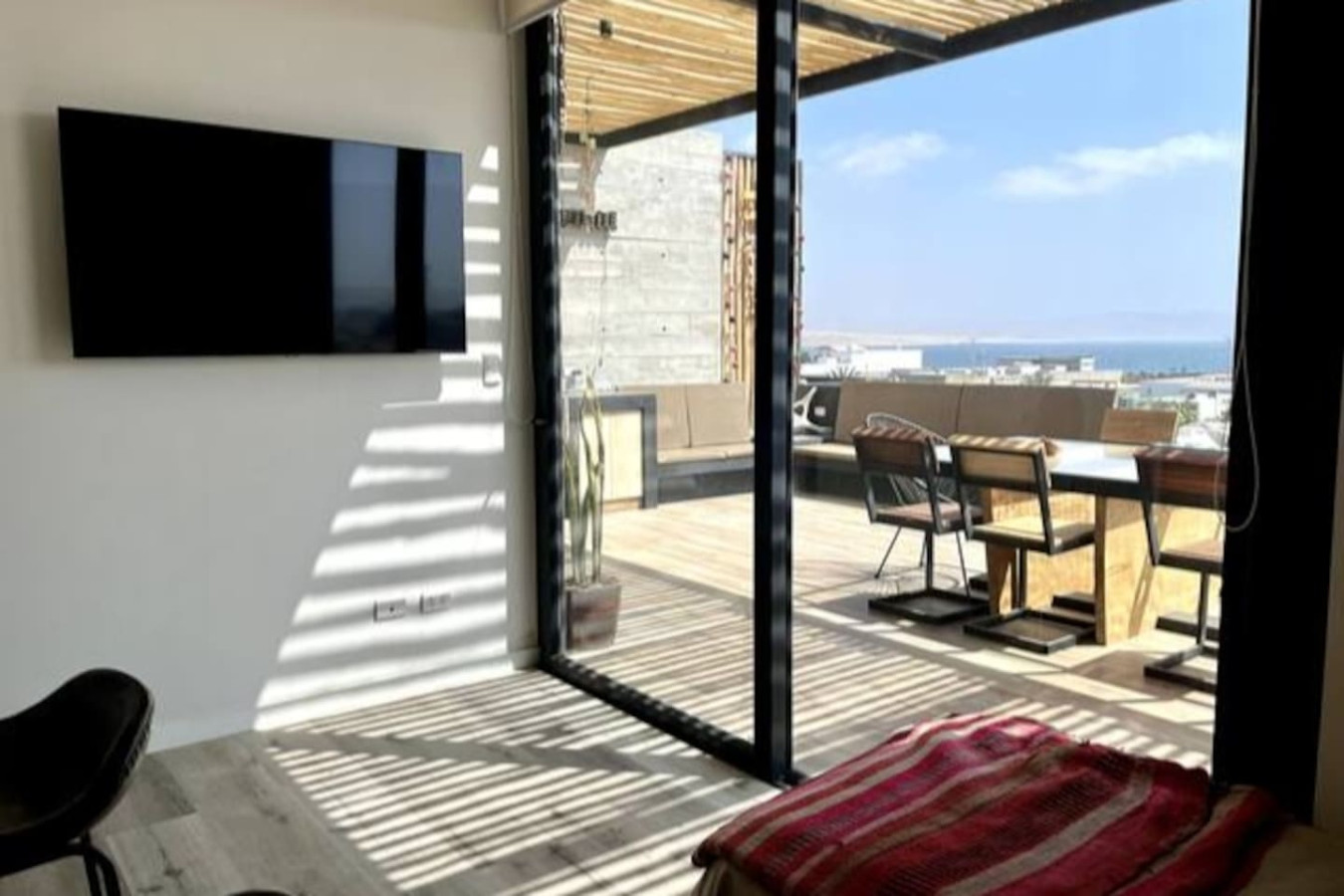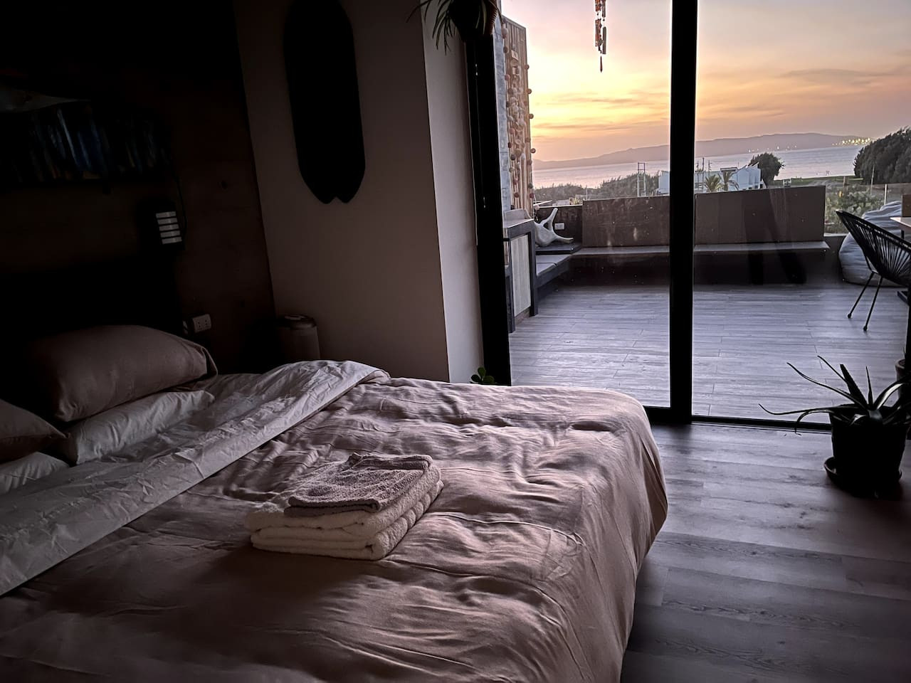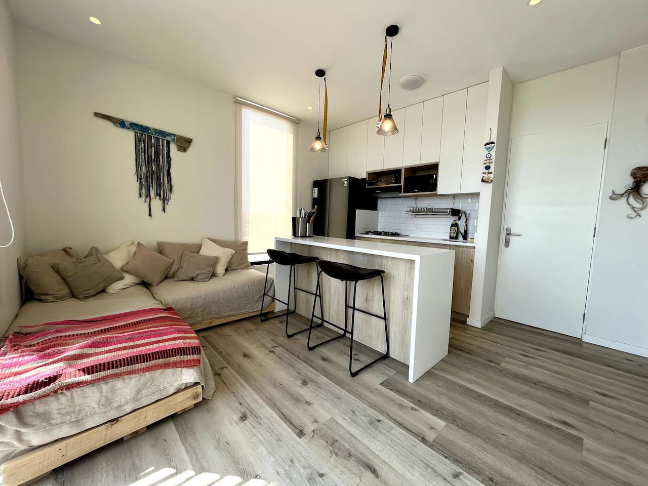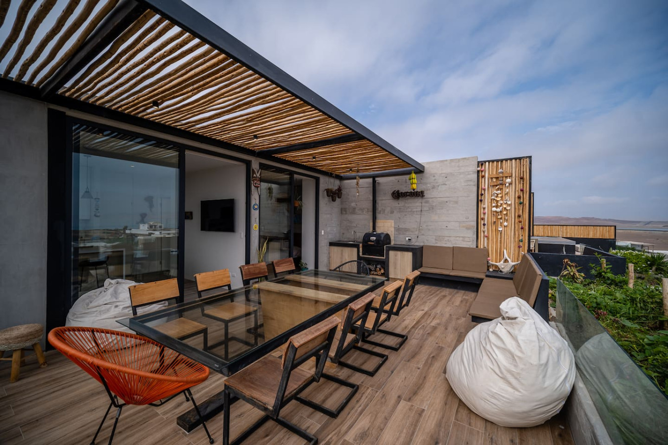 / nightDesigned for singles & couples, this unique apartment suits kitesurfers, fitness lovers, and remote workers. Personal touches abound, with the owner handcrafting most furniture and decor. Top-floor(4th) location with a stunning rooftop terrace for ocean & National Reserve views. Fully stocked kitchen, comfy king bed, BBQ, ourdoor garden & fiber optic internet. 5min walk to Kite Point, 1km to Paracas National Park. Onsite coworking & gym facilities. Perfect for long-term stays. he apartment is modern, built in 2021 and comes with more than necessary amenities. You can expect to rent for a weekend and want to stay a month! Please note that this unit is located on the 4th floor, without an elevator, but the breathtaking views make the climb worth every step! The apartment offers ample outdoor terrace space, allowing you to fully embrace the beauty of Paracas. Inside, you'll find an open kitchen and living area, a bedroom with generous closet space, a bathroom with desert views, and a washing machine just before entering. Most notably, the rooftop terrace provides stunning vistas of the National Reserve and the ocean. A combo charcoal grill and smoker is on the terrace for guests to enjoy delicious outdoor cooking while watching the stunning sunsets. Our community is the home to many kite surfers and sports enthusiasts, creating a vibrant atmosphere. Guests can step out of the apartment and reach the entrance of the National Park (Reserva Nacional de Paracas) in just 1.3km, perfect for morning runs or bike rides within the reserve. Afterwards, take a refreshing swim in the 40m saltwater lagoon or enjoy a dip in the pool. The common areas and the community itself contribute to the unique experience of staying in this apartment. Notably, this unit is environmentally friendly, featuring handmade furniture, decor, and a bohemian vibe. It is also the most economical option in Aldea, so take advantage of this exceptional value! From April 15, 2024, to April 15, 2025, there will be a construction project taking place within the condominium. While there may be some noise during business hours, all common areas will remain fully accessible. To thank you for your patience, we are offering a special discounted rate during this period. We appreciate your understanding!