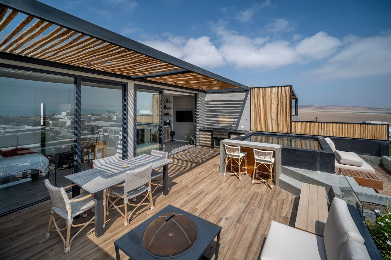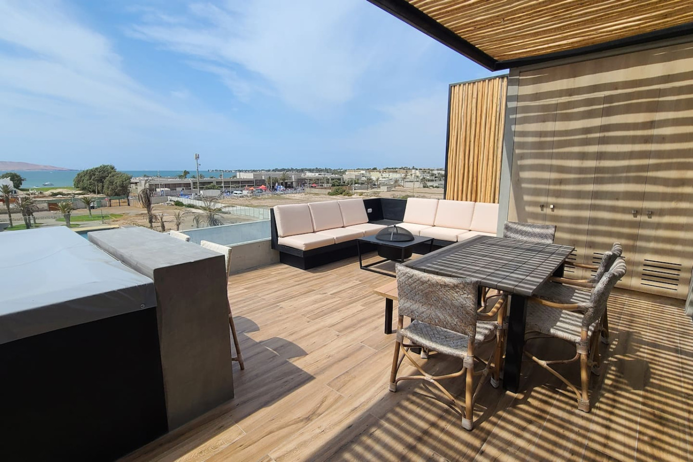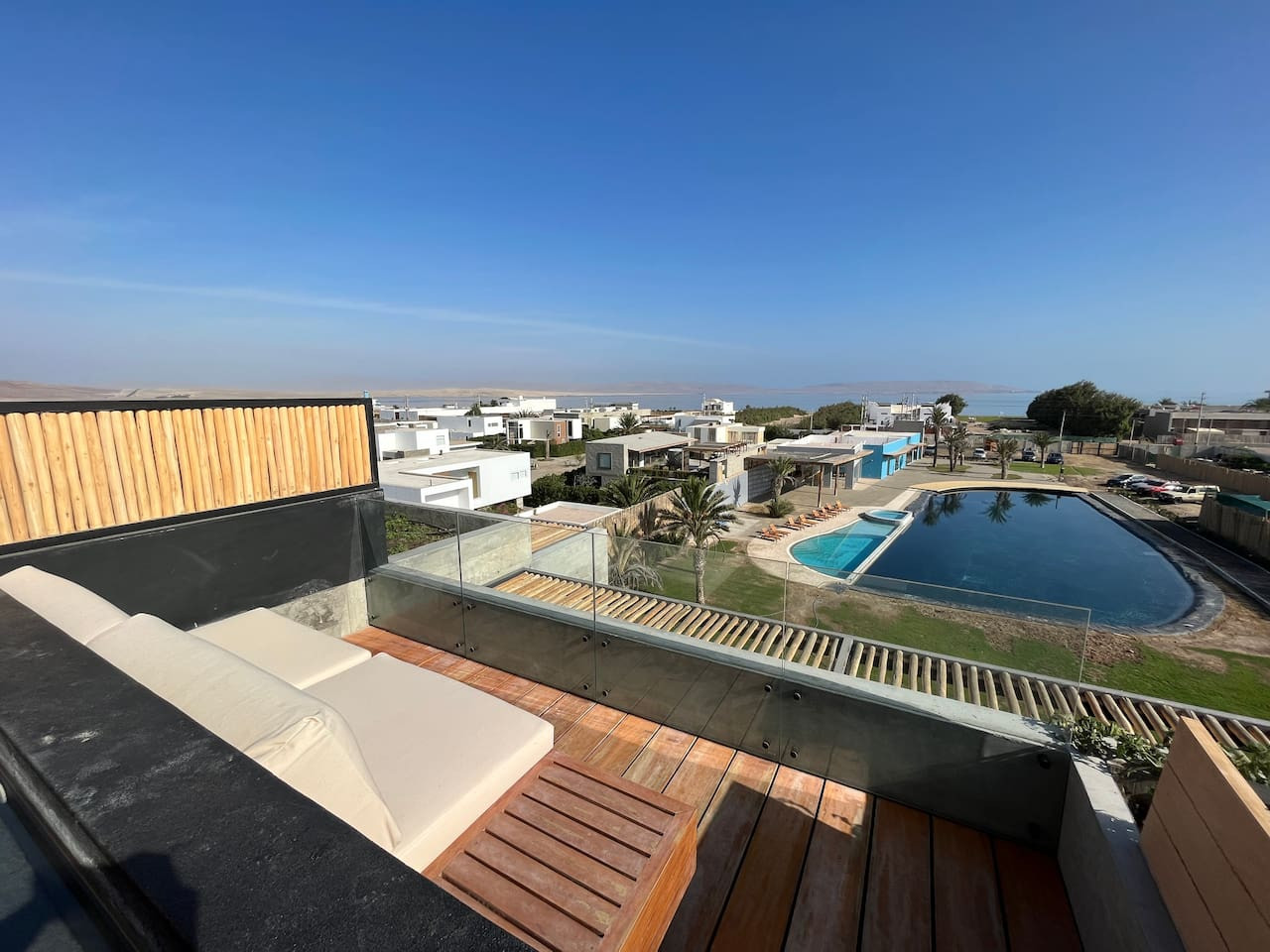 / nightGet ready for a romantic getaway at our Paracas Penthouse! Enjoy a private pool (not heated), a large terrace with BBQ, and beautiful ocean views. Built at the end of 2021, this modern condo offers ample amenities, including a fully stocked kitchen, comfy king bed, Smart TV, fast internet, A/C & more! A workation place for kitesurfers, triathletes, fitness lovers & nomads. Just a 5-minute walk to the Kite Point & next to Paracas National Park. On-site Coworking & Gym. Long stays welcome! Experience pure luxury at this stunning apartment. From the stylish Crate and Barrel sofa to the top-of-the-line Rosen mattress and hand-created piece of wood art made by a talented Peruvian artist, every detail has been carefully chosen to provide a truly intimate stay. Disconnect from the world and unwind by the refreshing pool while enjoying the mesmerizing ocean view. The beautiful garden adds to your tranquil stay. The fully equipped kitchen and high-quality linens ensure convenience and comfort. You can even enjoy a shower with a view of the National Reserve! This is a very special unit to rent. From April 15, 2024, to April 15, 2025, there will be a construction project taking place within the condominium. While there may be some noise during business hours, all common areas will remain fully accessible. To thank you for your patience, we are offering a special discounted rate during this period. We appreciate your understanding!