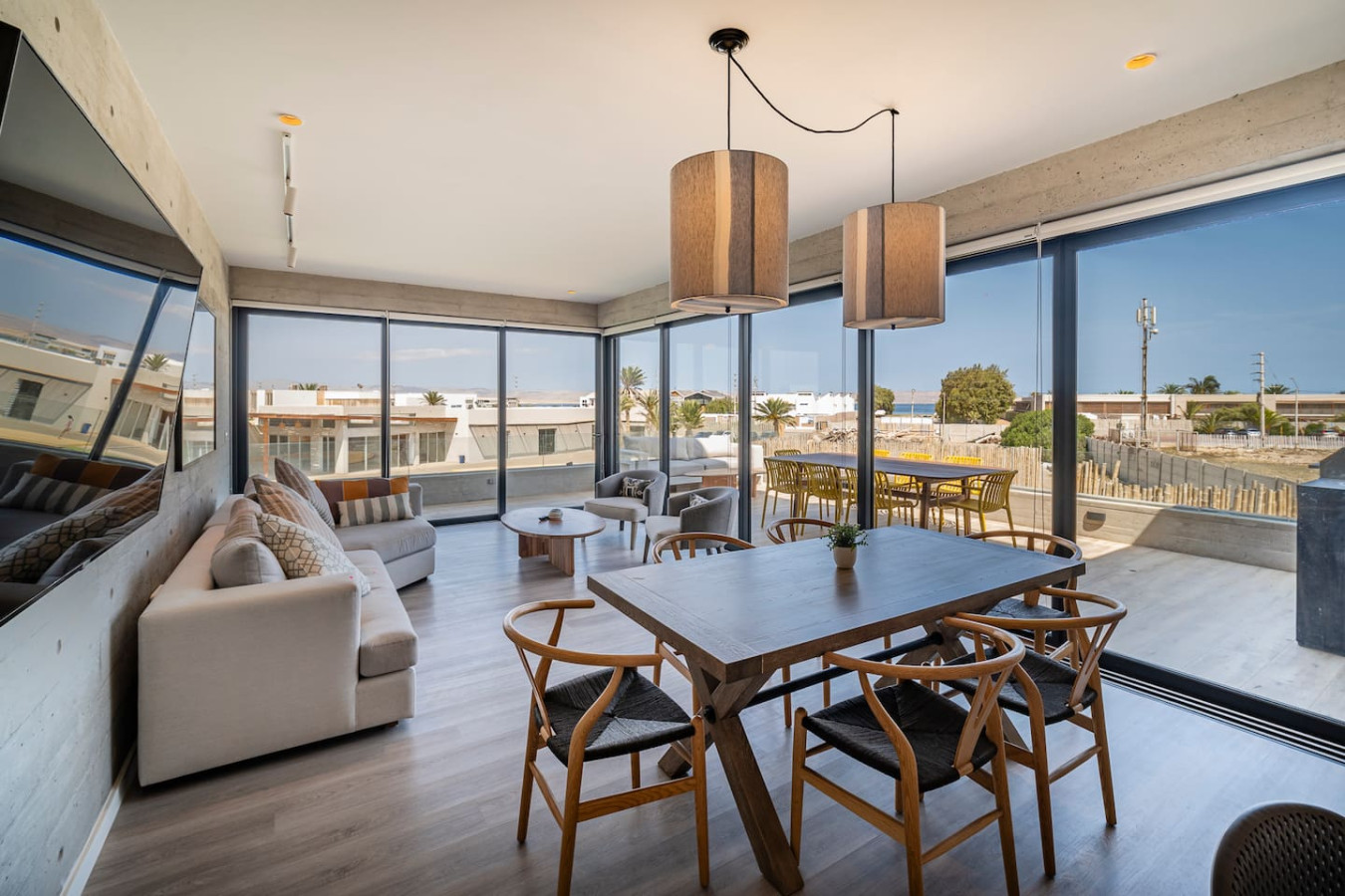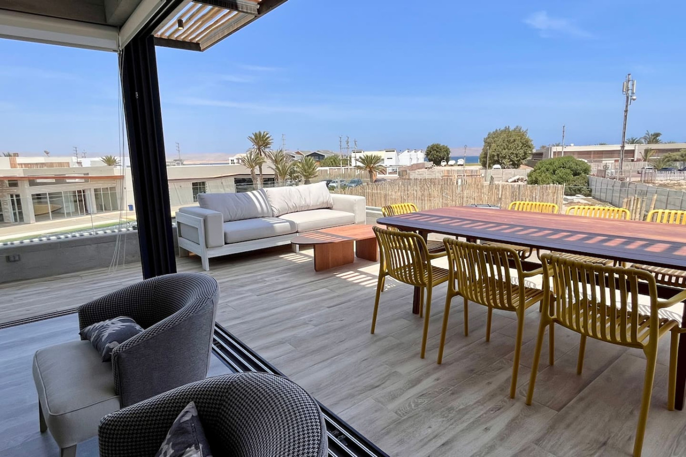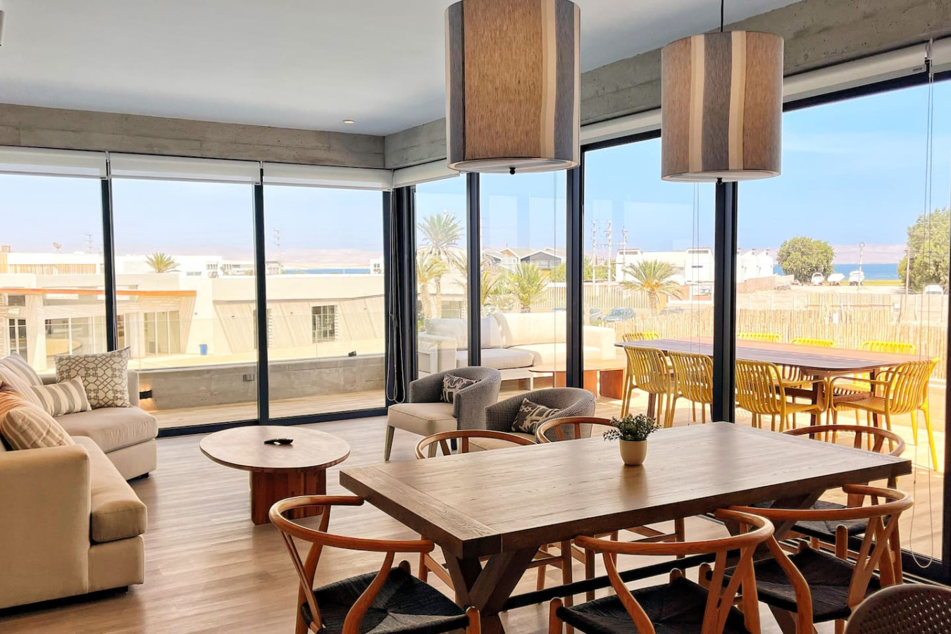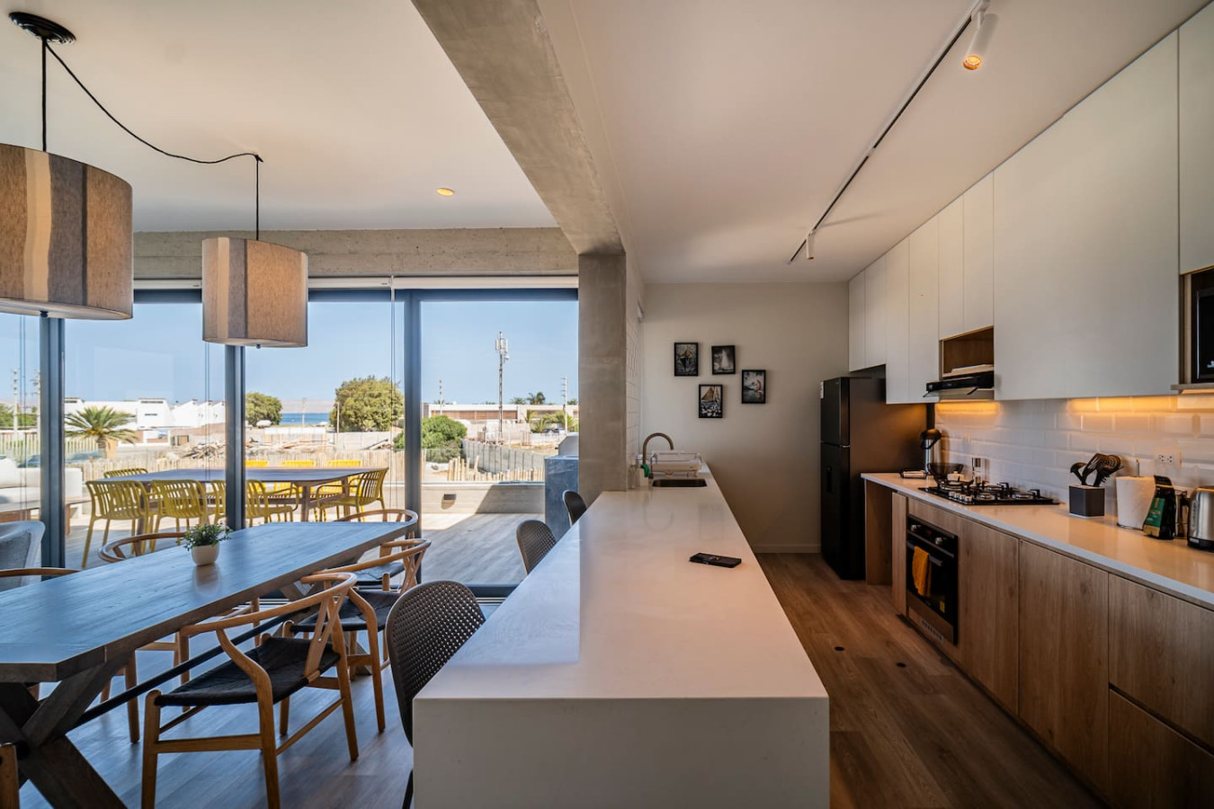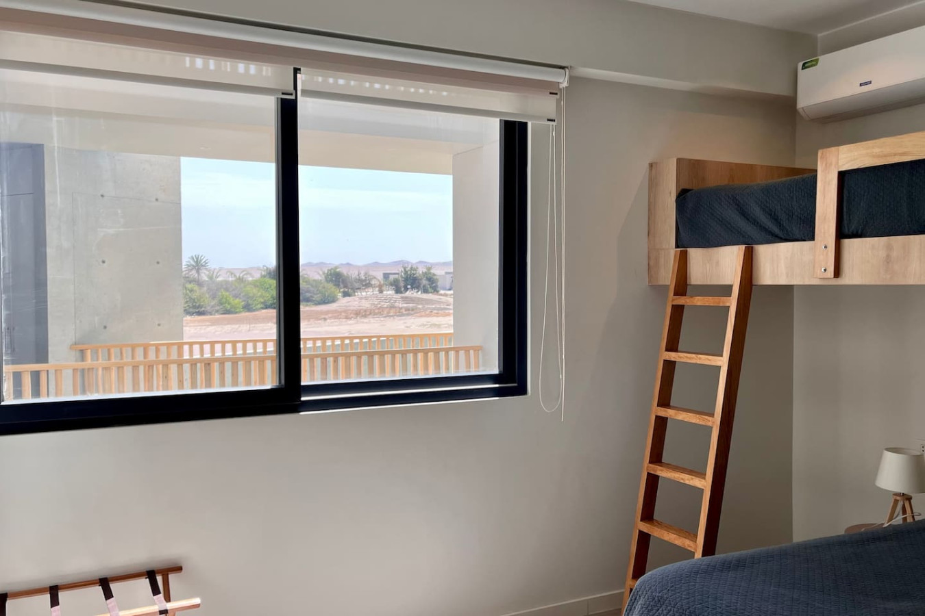 / nightBuilt in 2023, this brand new unit is a gem because if its giant terrace corner terrace with open windows bringing the desert and ocean vibes inside. One of the largest condos in the building, this unit can comfortaby fit up to 9 adults, or 11 people including the service room. Time to gather the fam and head to Paracas! It is also located at Kite Club Paracas, which offers guests full access to shared amenities including: a gym, lagoon, shared swimming pools and coworking space. The living room and terrace are huge, and connect the indoor and outdoor space for ease of BBQing and relaxing to watch the incredible sunsets. The main bedroom has a King bed + ensuite bathroom, the second bedroom offers a Queen bed and two individual beds, and the 3rd bedroom has a double bed and a single bed in addition to its ensuite bathroom. The maid's quarters can be used for a nanny or for kids, it does have a toilet and shower but please note this space is not accommodating for 2 grown adults, which is why we limit the occupancy to 9 adults max. The unit is located on the second floor, in a corner space, closest to the ocean. It had top furnishings and special attention to detail. From April 15, 2024, to April 15, 2025, there will be a construction project taking place within the condominium. While there may be some noise during business hours, all common areas will remain fully accessible. To thank you for your patience, we are offering a special discounted rate during this period. We appreciate your understanding!
