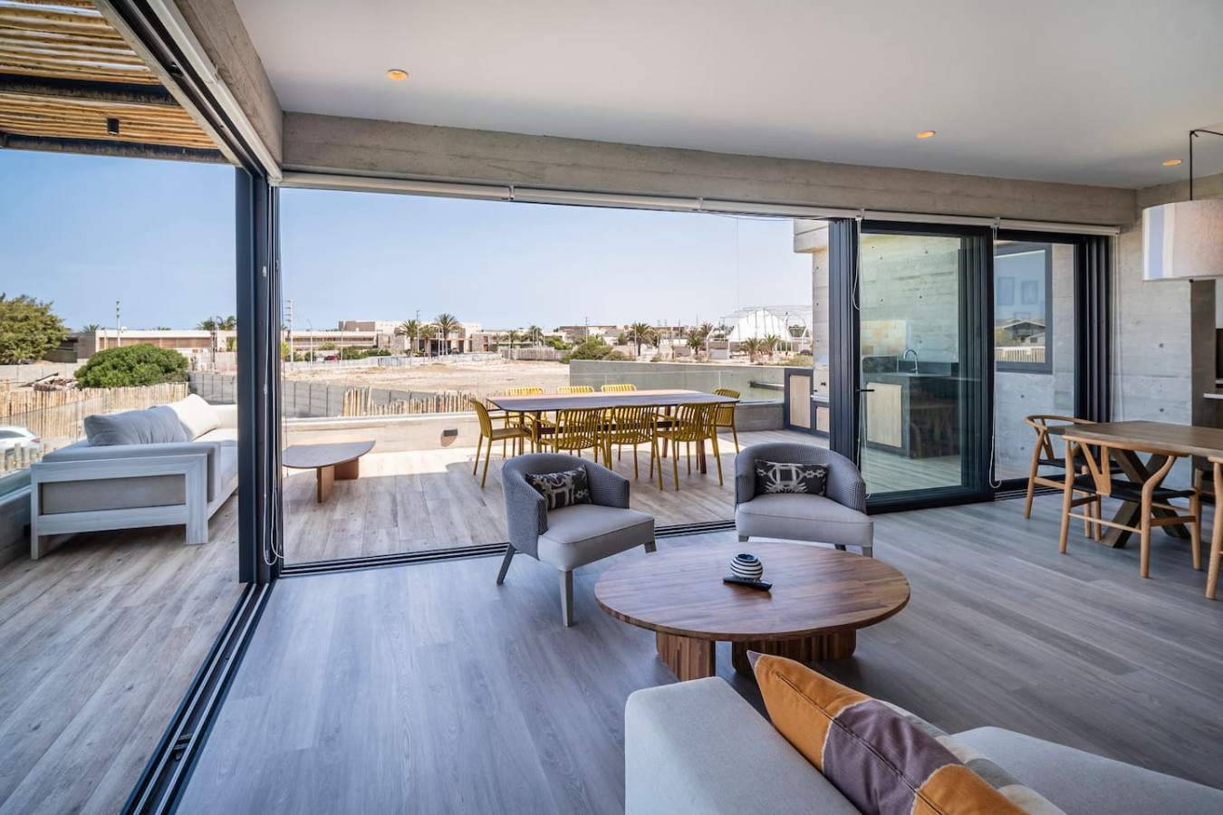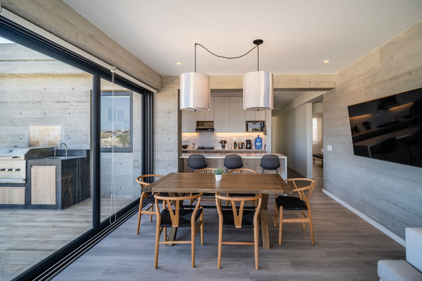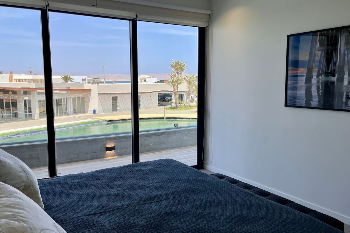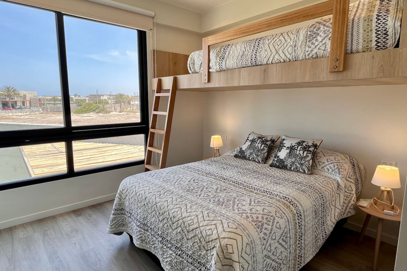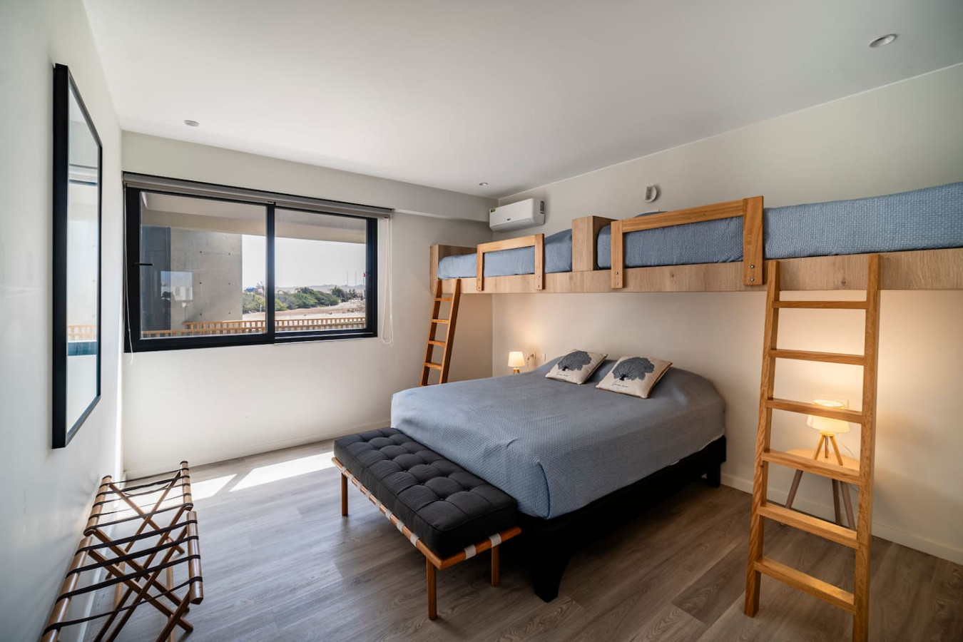 / nightBuilt in 2023, this brand new unit is a gem because if its giant terrace corner terrace with open windows bringing the desert and ocean vibes inside. One of the largest condos in the building, this unit can comfortaby fit up to 9 adults, or 11 people including the service room. Time to gather the fam and head to Paracas! It is also located at Kite Club Paracas, which offers guests full access to shared amenities including: a gym, lagoon, shared swimming pools and coworking space. The living room and terrace are huge, and connect the indoor and outdoor space for ease of BBQing and relaxing to watch the incredible sunsets. The main bedroom has a King bed + ensuite bathroom, the second bedroom offers a Queen bed and two individual beds, and the 3rd bedroom has a double bed and a single bed in addition to its ensuite bathroom. The maid's quarters can be used for a nanny or for kids, it does have a toilet and shower but please note this space is not accommodating for 2 grown adults, which is why we limit the occupancy to 9 adults max. The unit is located on the second floor, in a corner space, closest to the ocean. It had top furnishings and special attention to detail. From April 15, 2024, to April 15, 2025, there will be a construction project taking place within the condominium. While there may be some noise during business hours, all common areas will remain fully accessible. To thank you for your patience, we are offering a special discounted rate during this period. We appreciate your understanding!